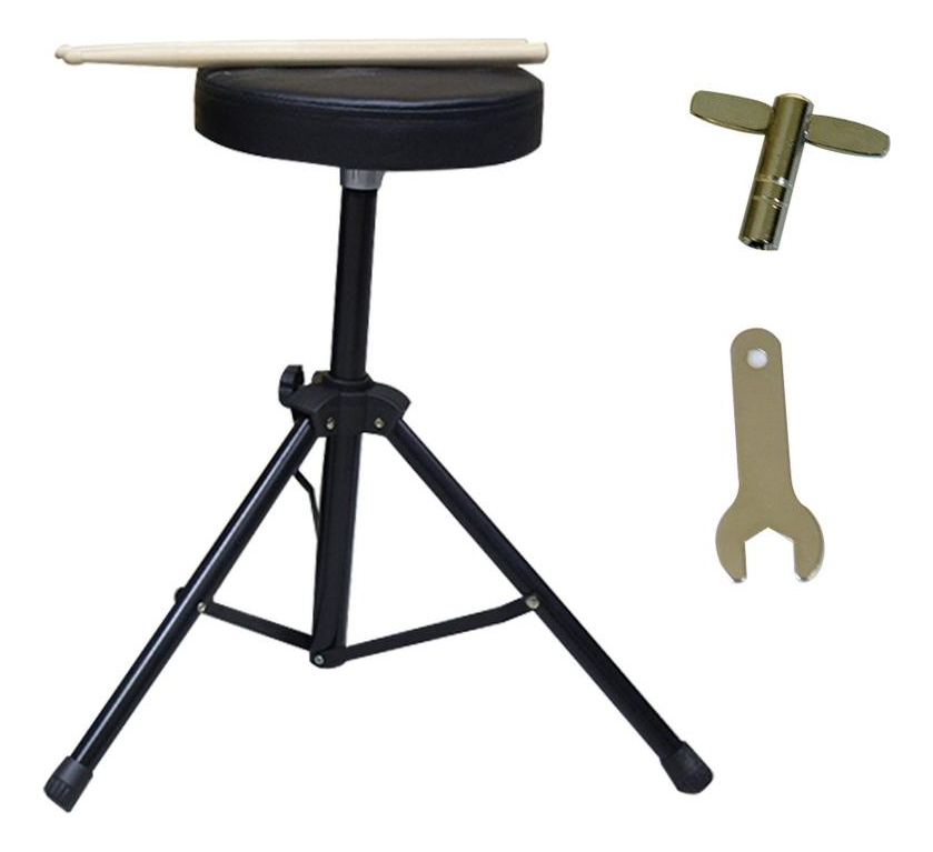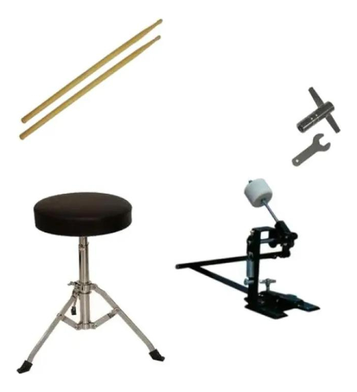 Set Completo: 1 bombo (16″x9,5″), 2 tambores (8″x4,5″ y 8″x3,5″), 1 platillo de 8″, piso, pedal de bombo y baquetas.