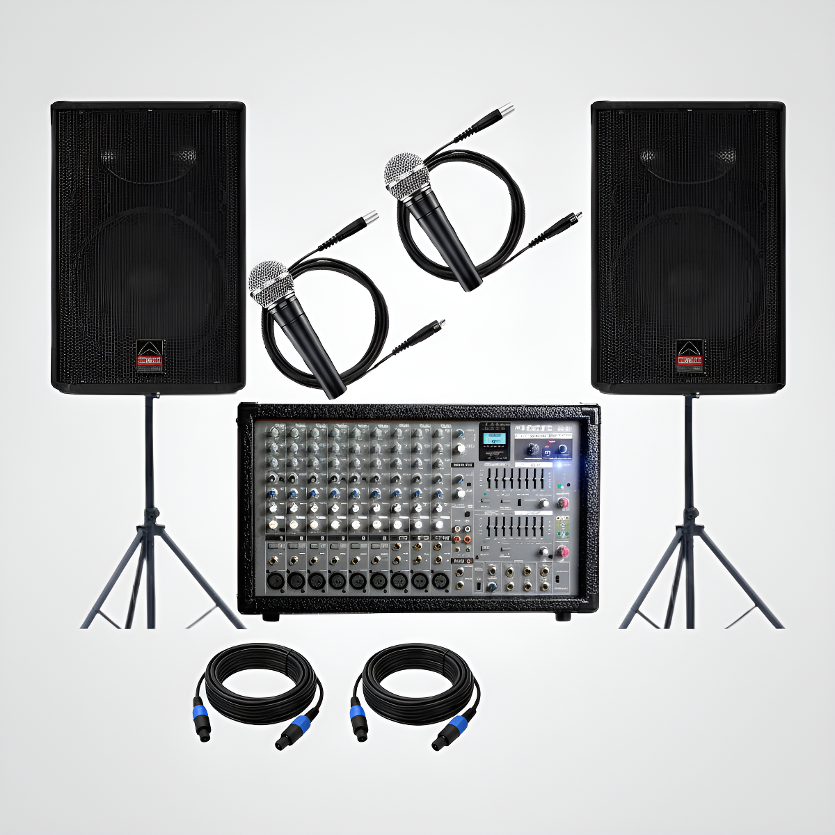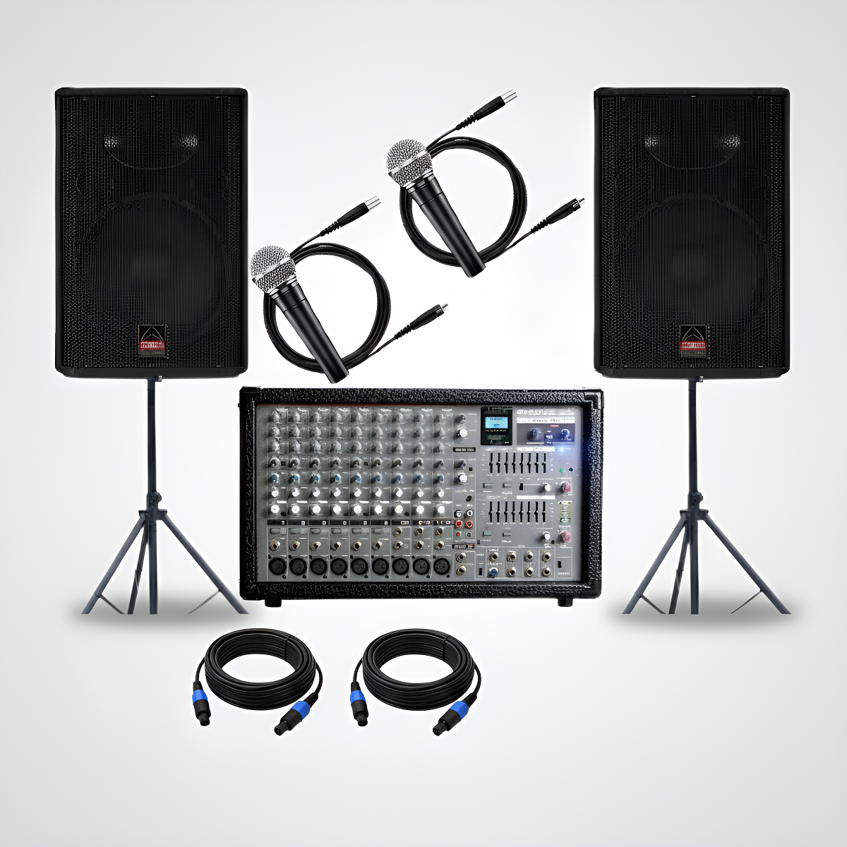 El paquete también incluye accesorios esenciales como 2 cables speakon de 10 m, 2 parlantes Eve P-X15, 2 micrófonos SM58 con cable, 2 atriles para parlante y 1 atril para micrófono, lo que garantiza que estés listo para cualquier evento. La Power Mixer 1082R es la opción perfecta para quienes buscan calidad, funcionalidad y un sonido excepcional en sus presentaciones.