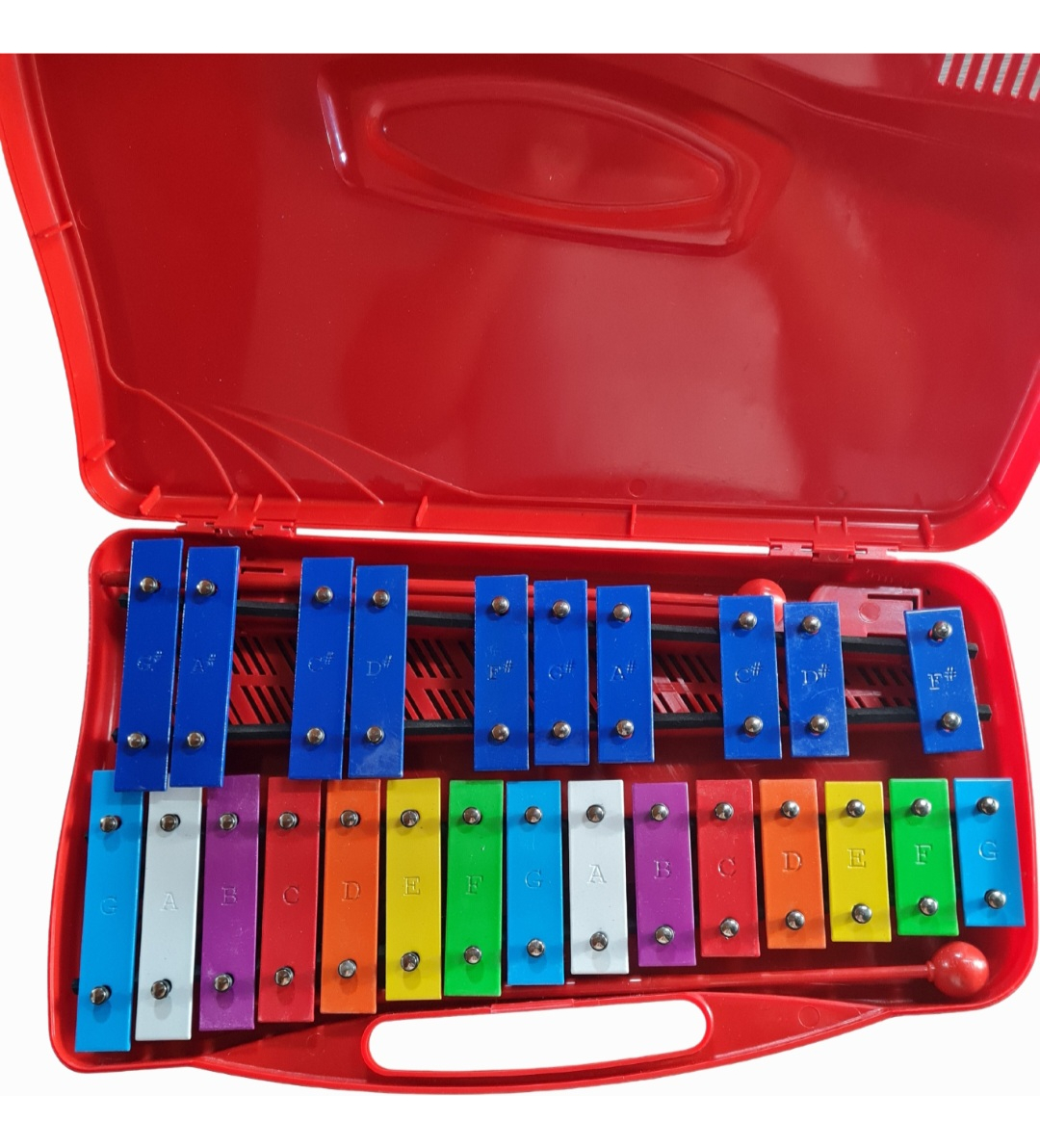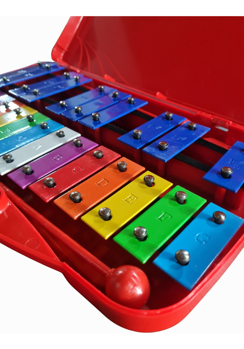 Fabricado con un cuerpo de plástico duradero y teclas metálicas, garantiza un sonido claro y resonante. Incluye mazos para facilitar el toque y un estuche que asegura su protección y transporte, convirtiéndolo en una opción práctica para clases o presentaciones.