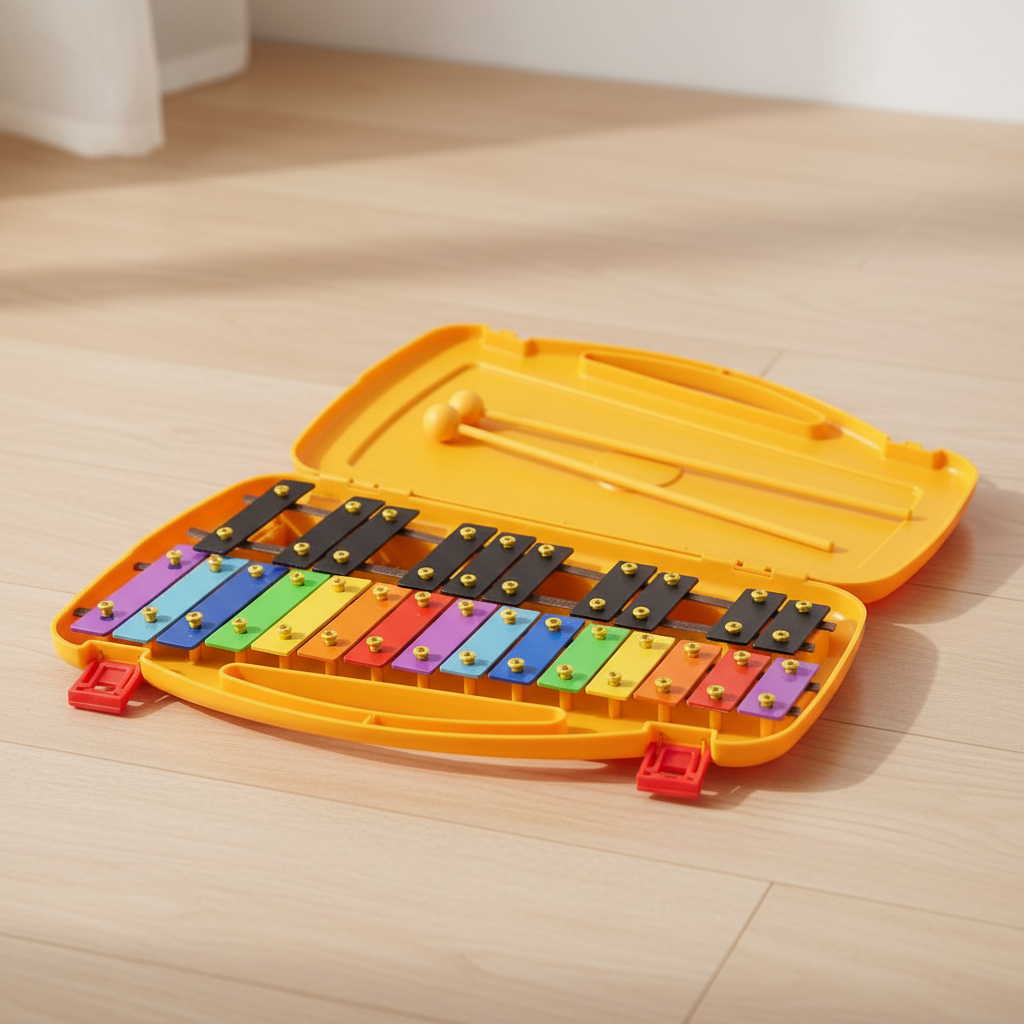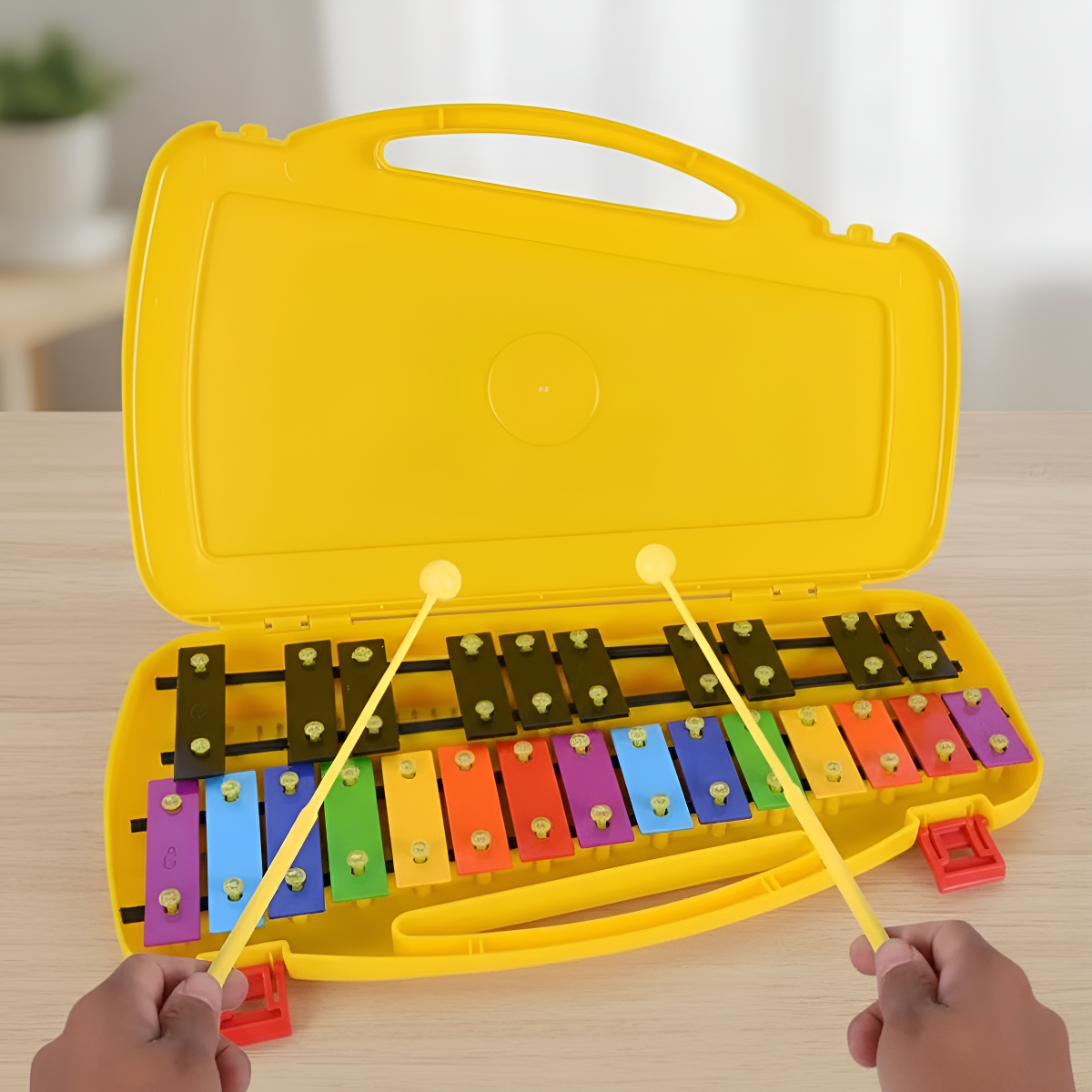 Maleta/Estuche Incluido: Viene con un estuche resistente y portátil en un vibrante color amarillo, ideal para transportar y proteger tu metalófono.