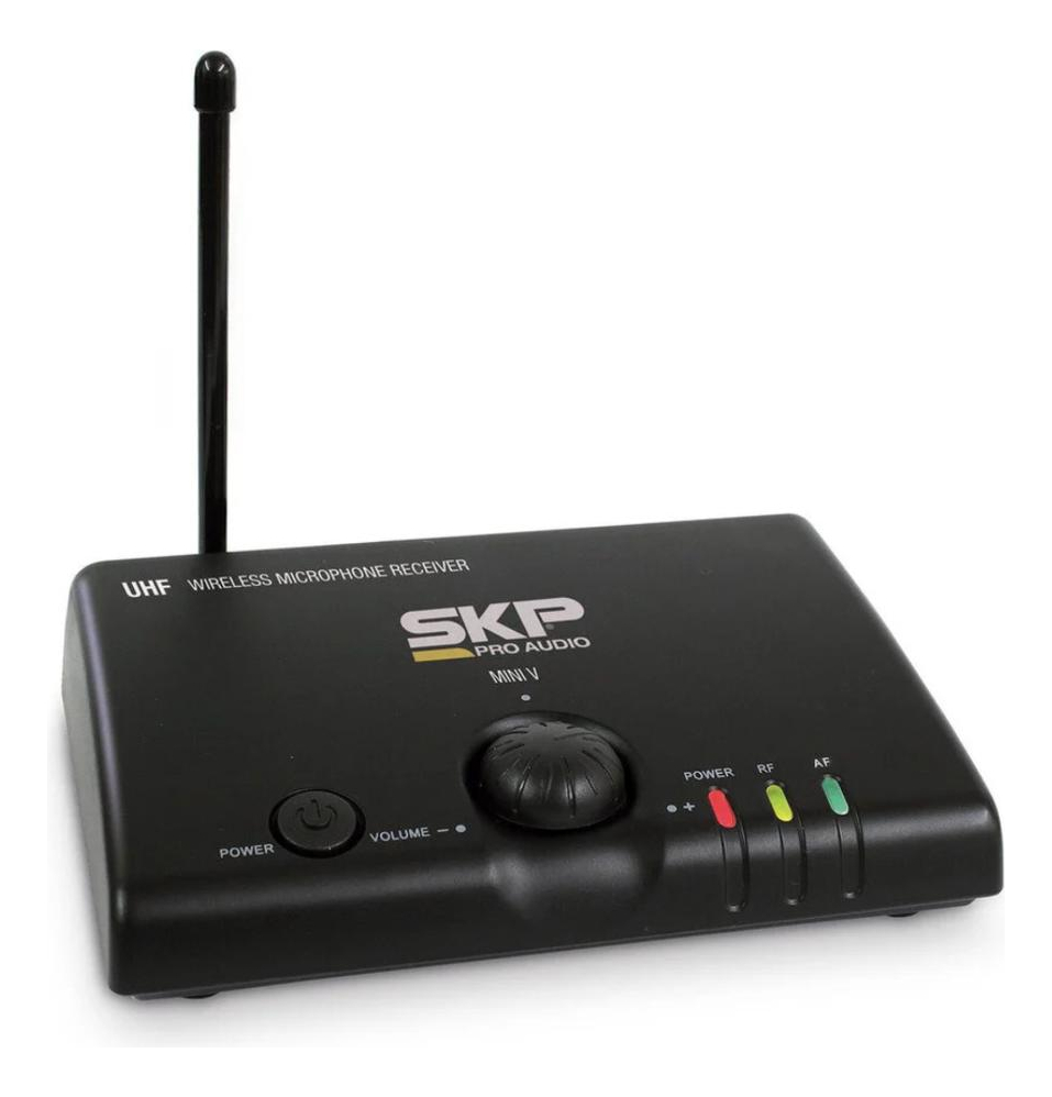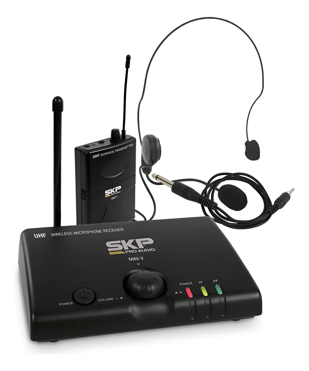 El Mini V de SKP es un micrófono de cintillo inalámbrico con una frecuencia UHF (ultra high frequency) y con una tecnología SMT (tecnología de montaje superficial) que hace que el equipo sea compacto, no utiliza mucho espacio y es fácil de transportar. Es utilizado principalmente para animaciones, discursos, teatros, entre otros.