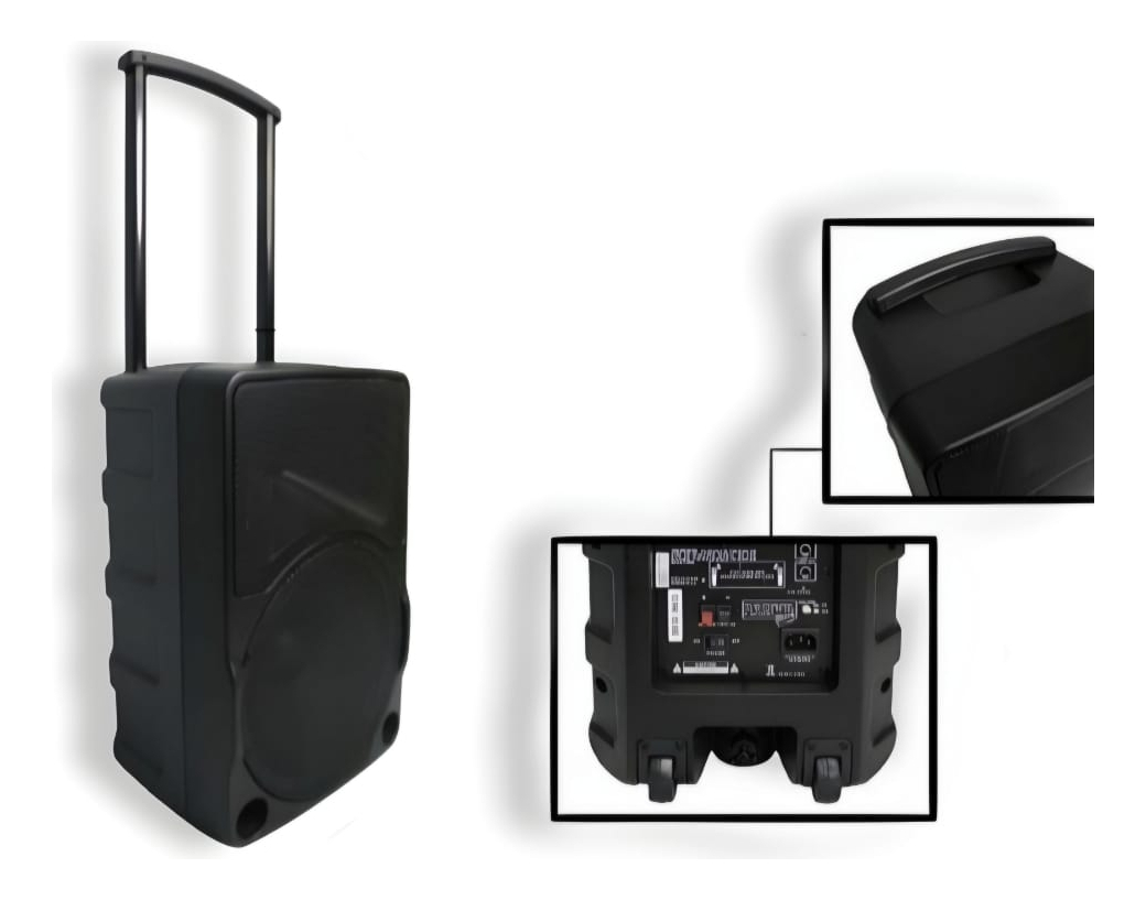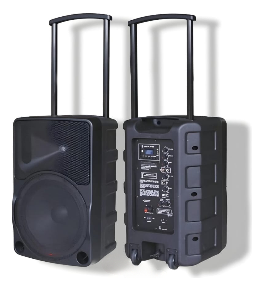 Este parlante puede reproducir música en formato MP3 y se alimenta tanto de corriente alterna como directa. Incluye una pantalla digital para USB y tiene función de karaoke, con la posibilidad de conectar dos micrófonos simultáneamente.