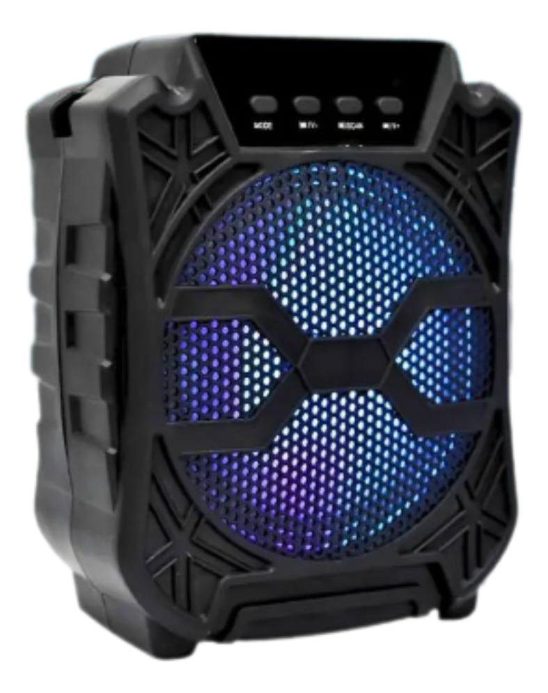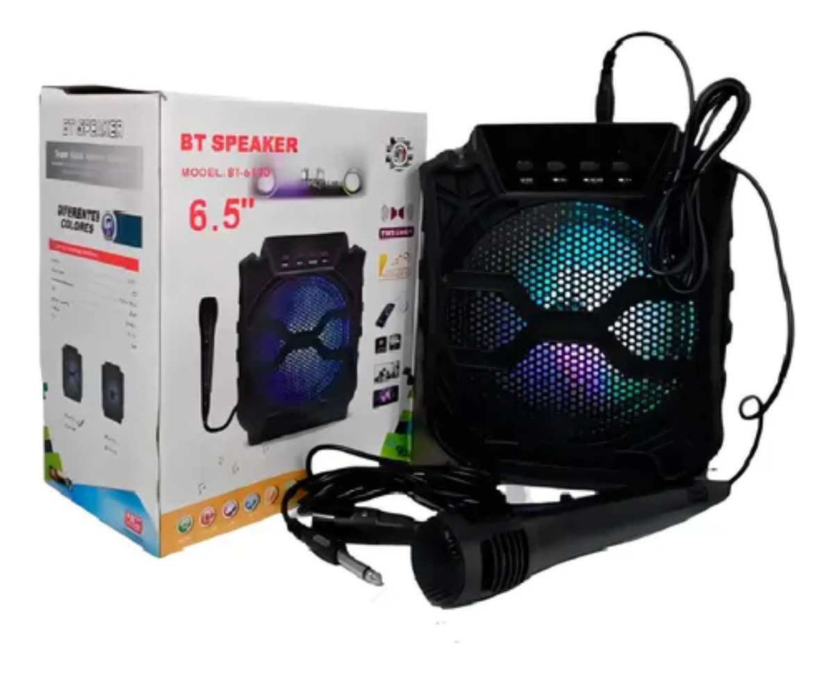 Parlante Karaoke Titaniux con micrófono y conexión Bluetooth.Parlante con luces LED de diferentes coloresDiviértete con tus amigos y familiares, saca todo tu talento musical cantando tus canciones favoritas, incluso aquellos éxitos de antes que siguen vigentes. También puedes escuchar tu música favorita, conectando tu dispositivo móvil al parlante a través de la función bluetooth incluida.Modelo: BT-6121Color: NegroEspecificaciones técnicas:Tamaño: 6.5″Potencia: 5WRespuesta de frecuencia: 150Hz-18KhzBatería: 1200mAhVoltaje: DC 5VDimensiones: 17cm largo x 12 cm ancho x 22cm altoEntrada: USB, Micro SD, Aux 3.5mm, de micrófono 6.5mm, etc.Conexión BluetoothRadio FmAlcance hasta 10m con BluetoothLuces led de colores, mientras se reproduce la música.
