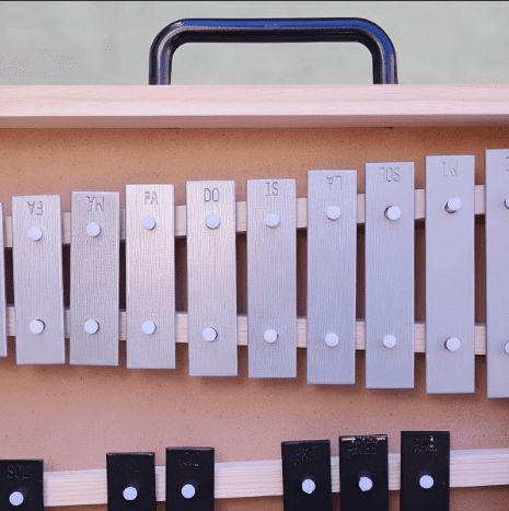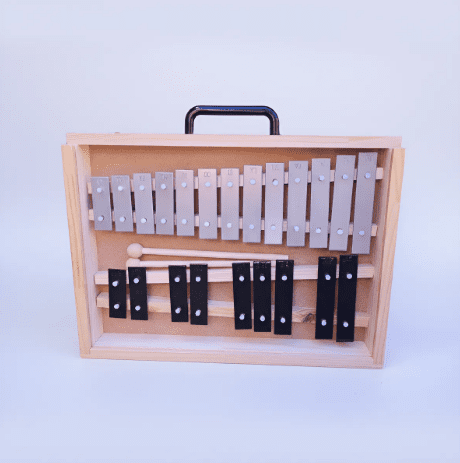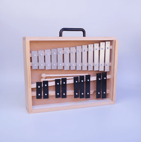 Su diseño incluye una caja de madera o chasis reforzado que mejora la resonancia y facilita el transporte, e incluye un par de baquetas para tocar de forma inmediata. El instrumento produce un sonido claro, brillante y preciso gracias a sus barras de metal cromado, perfecto tanto para principiantes como para músicos en formación.