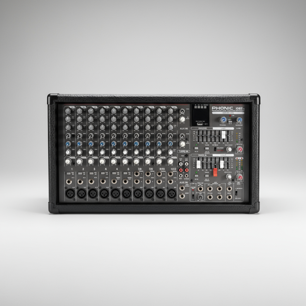 El Phonic Powerpod 1082R es una mezcladora potenciada de 800 W ideal para presentaciones en vivo y eventos. Cuenta con 10 canales, efectos digitales de 40 bits, ecualizador gráfico dual y alimentación fantasma +48 V para micrófonos de condensador. Incorpora conexión USB para grabar o reproducir audio directamente y ofrece gran versatilidad con sus múltiples entradas y salidas balanceadas. Compacta, potente y fácil de usar, es una solución completa para sonido profesional.